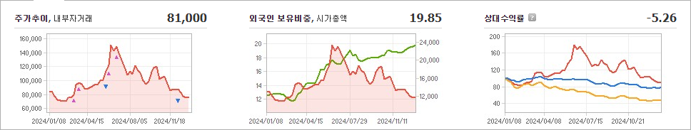 대주전자재료의 현재 주가는 81,000원으로, 전일 대비 7.85원이 하락했습니다. 주주 현황을 살펴보면 임중규 외 11인이 27.58%의 지분을 보유하고 있습니다. 이 회사는 전자 장비 및 기기를 제조하는 기업으로, 현재 장중 주가는 81,000원입니다. 대주전자재료의 시가 총액은 1조 2,570억 원이며, 발행된 주식 수는 15,480,593주입니다. 외국인 보유 비율은 19.85%이며, 장중 거래량은 230,656주에 달했습니다. 최근 매출액은 1,603억 원에 이릅니다.