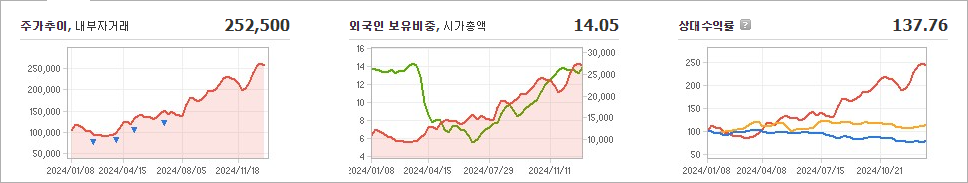 파마리서치의 현재 주가는 252,500원으로, 전일 대비 8,000원이 하락했습니다. 주주 현황을 살펴보면 정상수 외 8명이 총 38.17%의 지분을 보유하고 있습니다. 이 회사는 의료 장비 및 서비스 분야에 속하며, 현재 장중 기준으로 주가는 252,500원입니다. 파마리서치의 시가총액은 2조 7,062억 원이며, 총 발행 주식 수는 10,509,600주입니다. 외국인 보유 비율은 14.05%이며, 장중 거래량은 190,650주에 달했습니다. 최근 매출액은 2,470억 원을 기록했습니다.