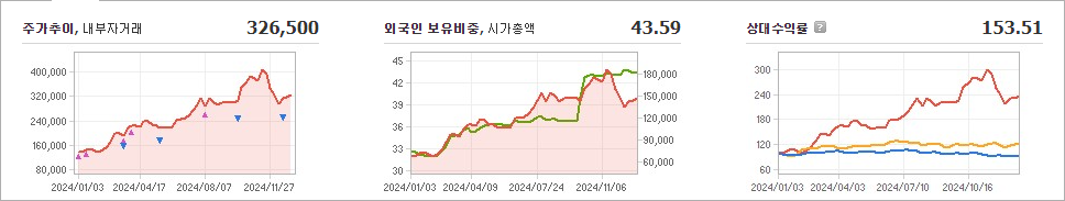 현재 한화에어로스페이스의 주가는 326,500원으로, 전일 대비 변동이 없습니다. 주주 현황을 살펴보면, 한화와 두 명의 개인이 총 33.98%의 지분을 보유하고 있습니다. 이 회사는 상업 서비스 분야에 속하며, 장중 기준으로 주가는 326,500원입니다. 한화에어로스페이스의 시가총액은 16조 3,636억 원이며, 총 발행 주식 수는 45,581,161주입니다. 외국인 보유 비중은 43.59%로, 장중 거래량은 204,610주에 달했습니다. 또한, 이 회사의 매출액은 64,151억 원에 이릅니다.