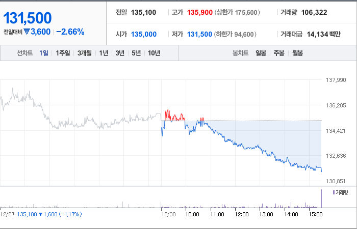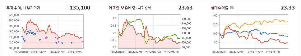 현재 SK의 주가는 135,100원으로, 전일 대비 1,600원이 하락한 상태입니다. SK의 주주 현황을 보면 최태원과 38명의 주주가 총 25.52%의 지분을 보유하고 있습니다. SK는 석유 및 가스 분야의 기업으로, 현재 주가는 장중 기준으로 135,100원입니다. SK의 시가총액은 9조 5,341억 원이며, 발행 주식 수는 72,502,703주입니다. 외국인 보유 비중은 23.63%이며, 장중 거래량은 74,944주에 달했습니다. SK의 매출액은 944,599억 원에 이릅니다.