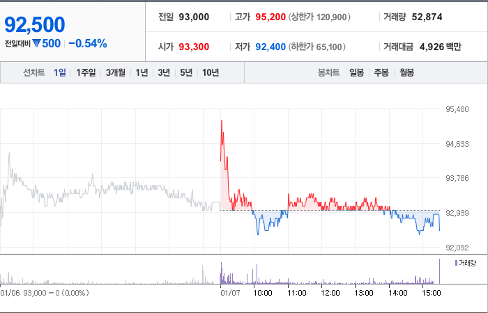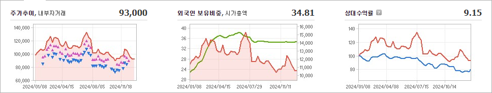 현재 SOOP의 주가는 93,000원으로, 전일 대비 13.08원 하락했습니다. 주주 현황을 보면 쎄인트인터내셔널과 기타 7명이 26.33%의 지분을 보유하고 있습니다. SOOP는 인터넷 서비스 기업으로, 현재 주가는 93,000원입니다. 회사의 시가 총액은 1조 633억 원이며, 발행된 주식 수는 11,494,767주입니다. 외국인 보유 비율은 34.81%이며, 장중 거래량은 33,403주에 달했습니다. SOOP의 매출액은 3,115억 원에 이릅니다.